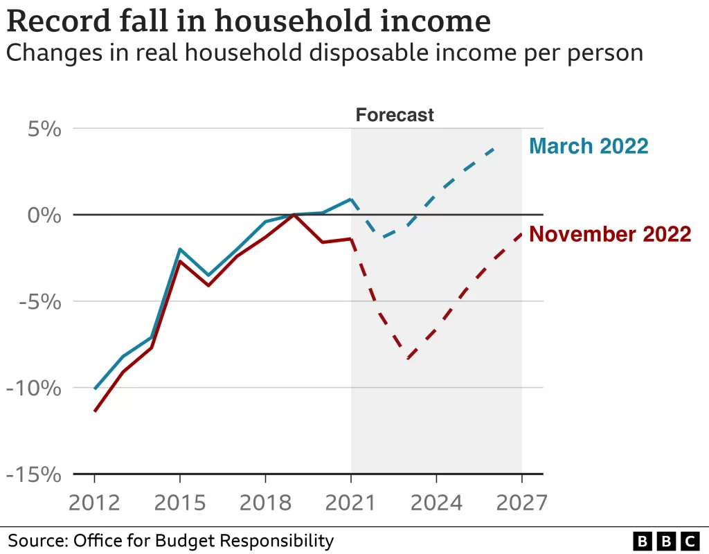 The U.K. independent Office for Budget Responsibility projects that the country faces its record sharpest fall in living standards. Real household disposable income, a measure of living standards, is forecast to fall by 4.3% in 2022-23.