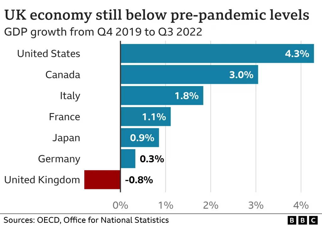 While it is true that global forces play a role, the fact that the UK is forecast to have the slowest growth of any G7 economy in 2023, plus the highest inflation, shows the uniquely bad situation the UK is in.
