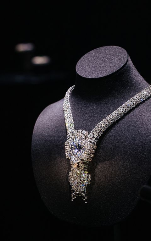 A stunning 180 carats of diamonds set in platinum. Its centrepiece is an 80-carat oval, flawless, D-color “Empire Diamond.” The diamond was ethically sourced in Botswana, cut and polished in Israel and set in Tiffany’s workshop in New York City. It’s the most expensive piece ever created by Tiffany.