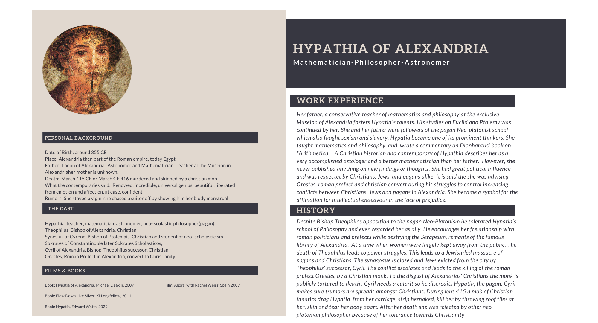 – Theon of Alexandria, her father is a teacher at the famous Museion in Alexandria